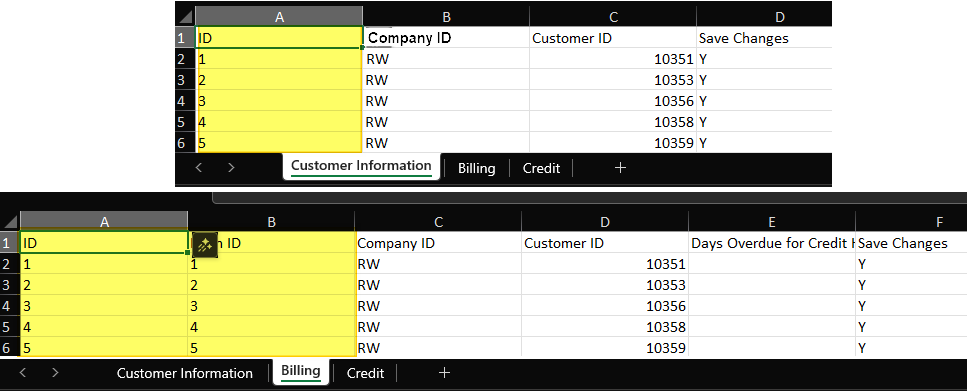- Open the P21 window and use a single record as your criteria to generate an exportable template. Fill out your data in Excel, making sure each tab uses ascending numerical IDs that link the records together.