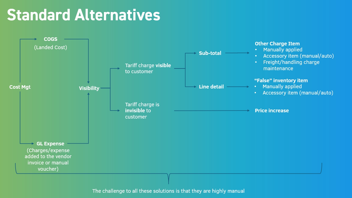 Manual Approach: Salespeople must calculate and add a tariff line for each item, using either “other charge” or “false inventory item” methods.