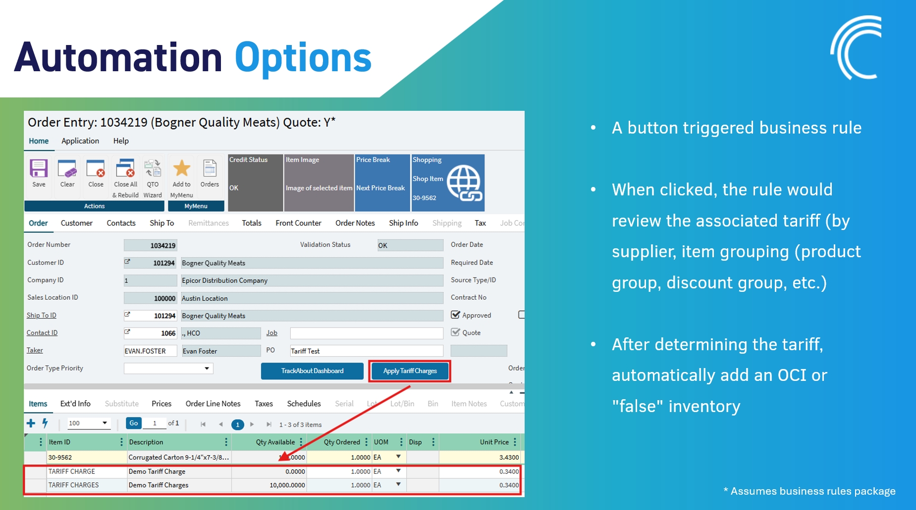 Business Rules: Add custom buttons or triggers in order entry or purchasing that automatically calculate and apply tariff charges based on item, supplier, or group. This can add “other charge” or “false inventory item” lines with calculated values, reducing manual entry.